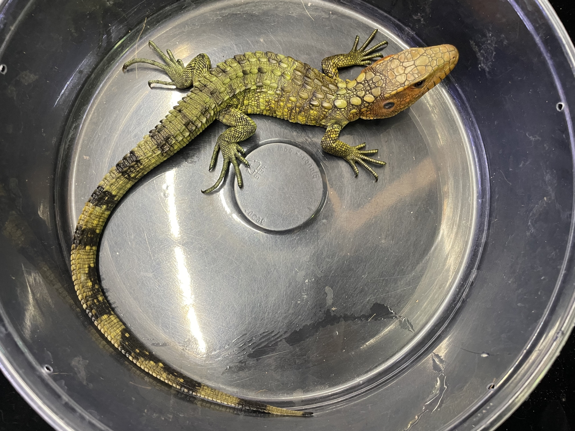 まだ若い個体ですが、体温が上がるとオスは頭部が黒っぽく胴体にイエローが発色してきます。
